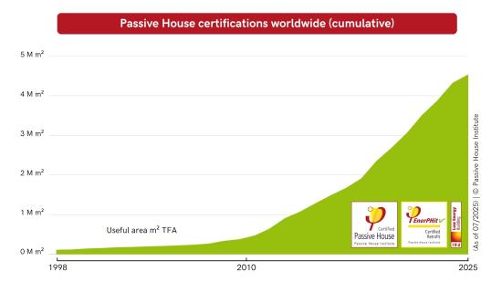 Passive House stands for healthy, comfortable living and impressive energy efficiency, regardless of the regional climate. Within the last several years, Passive House has rapidly increased in popularity, with over 49,600 units certified according to the strict Passive House Institute certification criteria, representing a total floor area of 4,528,000 m² TFA (as of 07/2025). Many of these quality-assured examples are included in the Passive House database, which documents nearly 6,050 Passive House buildings.